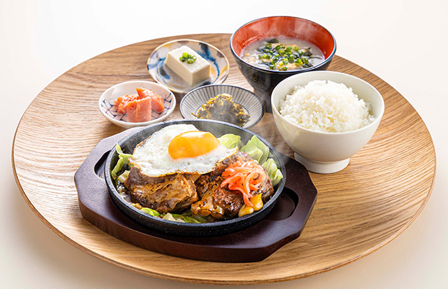 鉄板で香ばしく仕上げるソーキエッグ定食とともに、